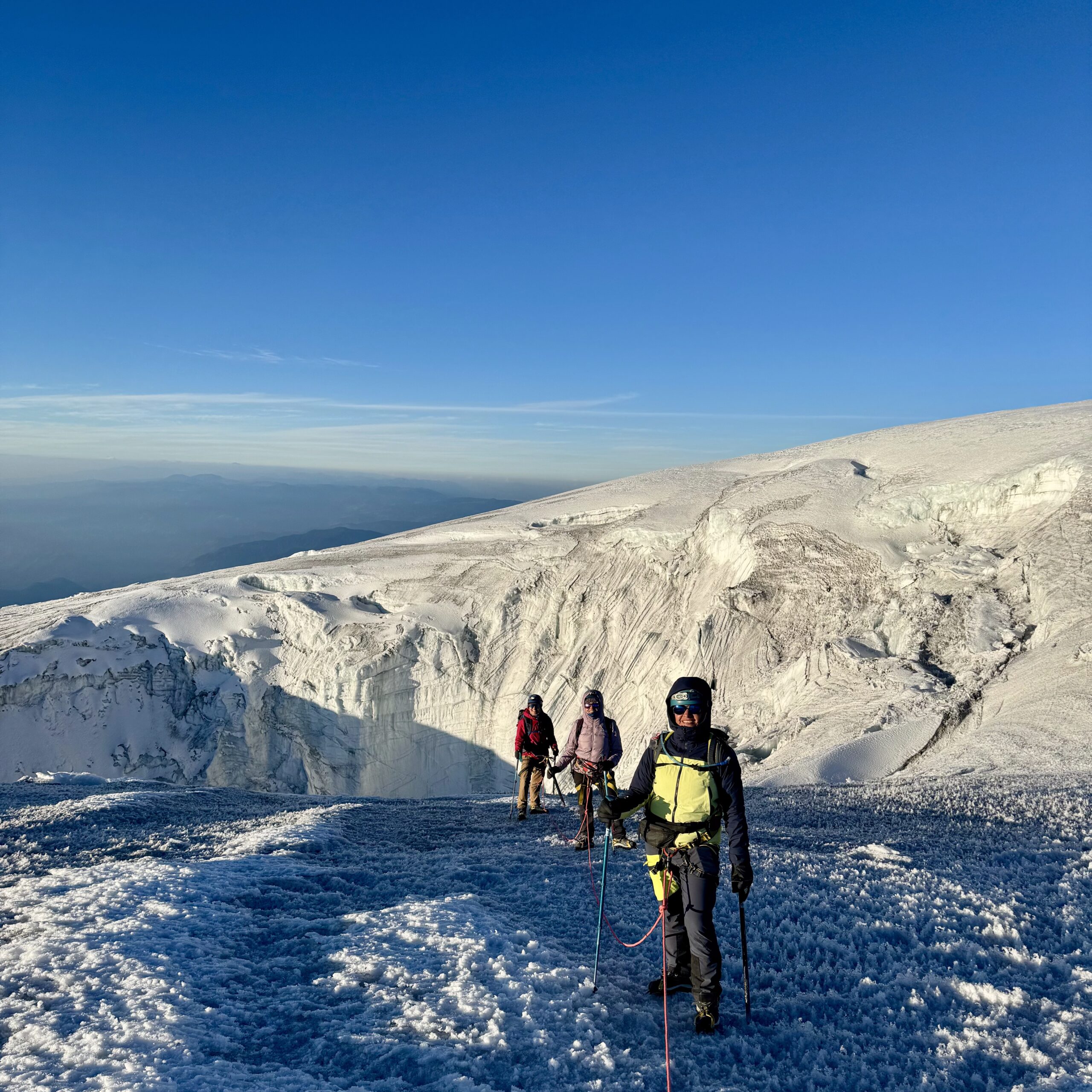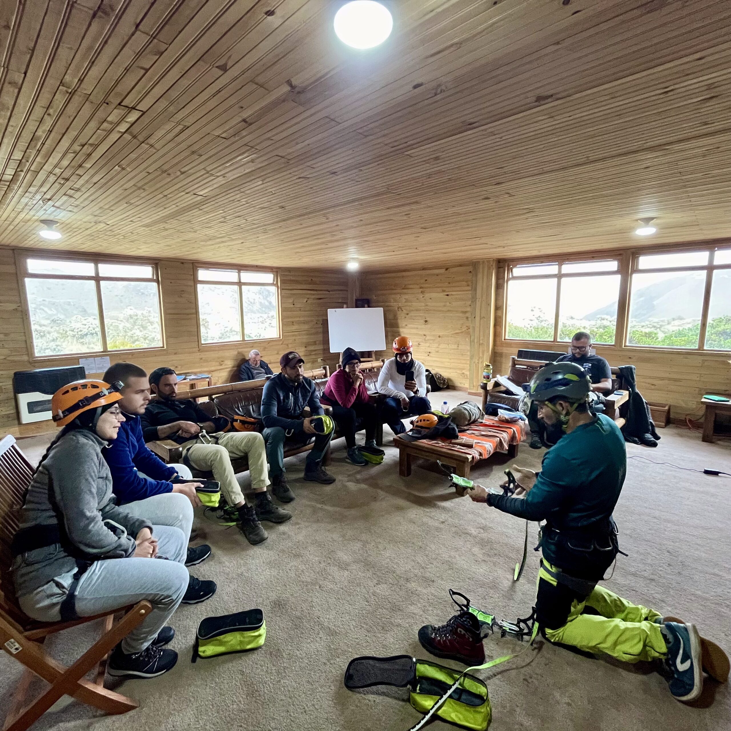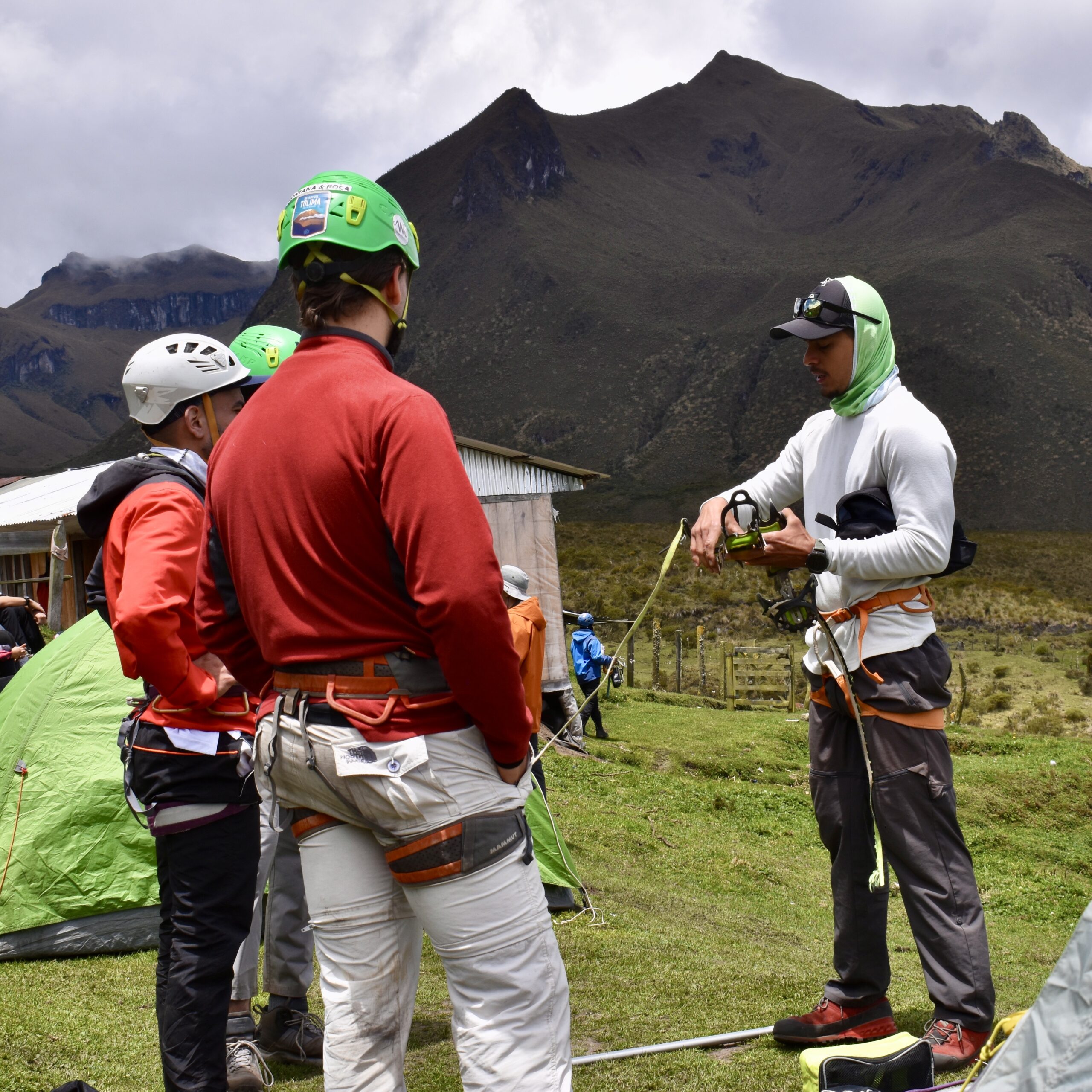 - Equipo para ascenso al glaciar completo: casco, arnés, mosquetón, piolet, crampones y cuerda.