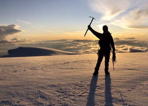 - Equipo para ascenso al glaciar completo: casco, arnés, mosquetón, piolet, crampones y cuerda